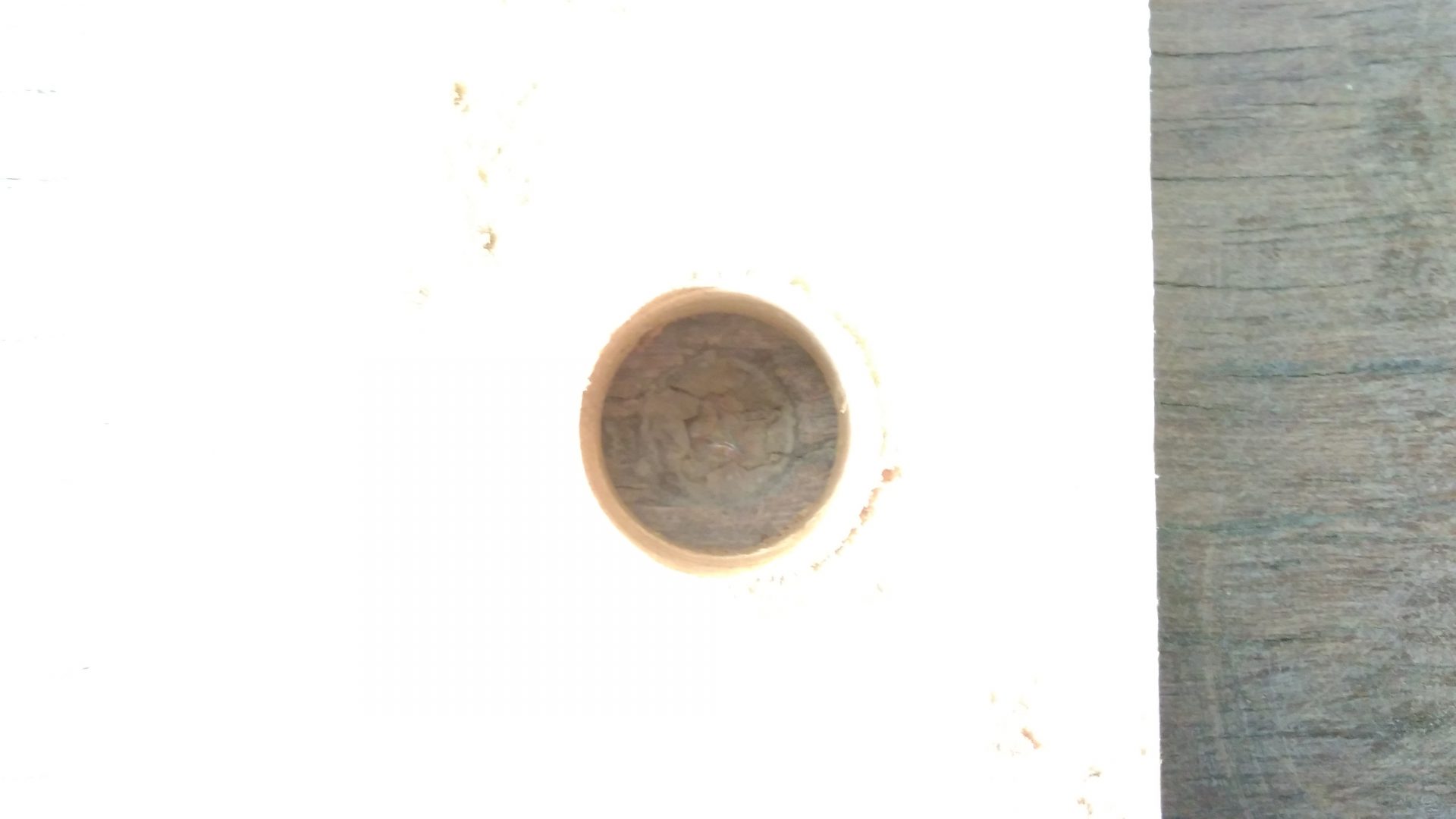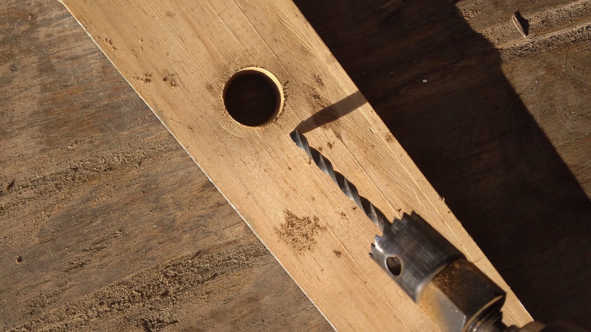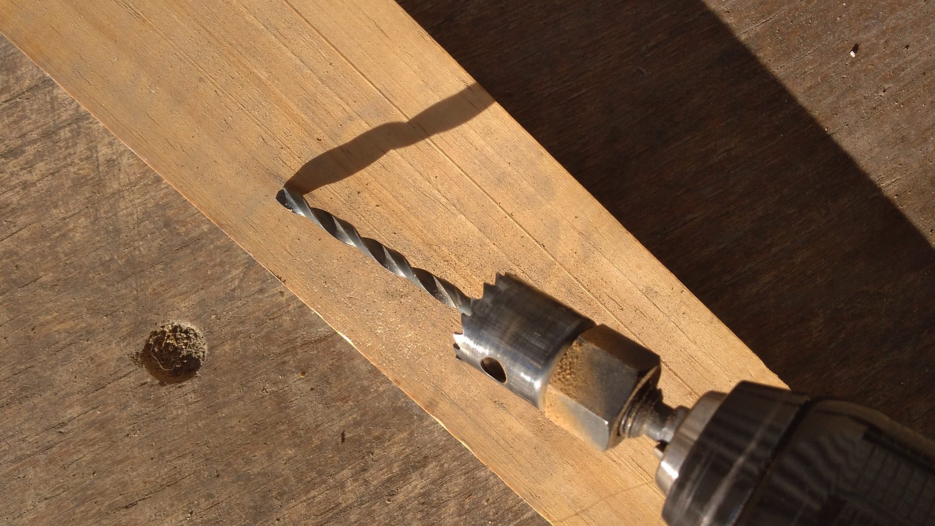 The trick with using the holesaw to remove the screws is to remove the mandrel (drill bit) that prevents the holesaw from jumping around when drilling. Obviously, it has to be removed because there is a screw where there would normally be wood. Instead, I made a guide block from a scrap piece of wood, and used this to prevent the holesaw from jumping around.