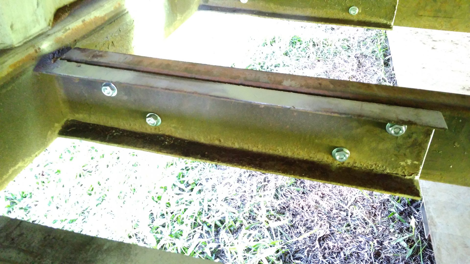 The problem with removing that massive steel plate is that the joists underneath it are all welded together, so removing the plate means removing the joists. But fortunately, we’ve got some extra joists that were removed from the front of the container. I took those and bolted them to the short joists left over after cutting out the plate.