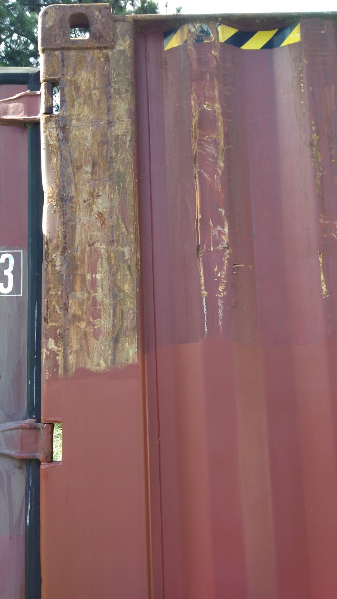 I’ve spent a lot of time preparing the container for painting because it was fairly well used since its manufacture in 2001. There were a lot of scratches and minor dents which had caused some surface rust. I wanted to remove all this and overcoat it with a good exterior steel paint.